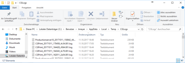 Generell gibt es drei “Prozesse”, die beim Productionserver Logdateien im Betrieb erstellen: die Productionserver10.exe (User Interface), cgrip.exe (wird beim Rippen eines Auftrags gestartet) und die cgprint.exe (wird beim Drucken gestartet). Während das User Interface nur einmal offen ist, werden pro Rip- bzw. Druckprozess jeweils eine cgrip.exe bzw. cgprint.exe gestartet. Und mit jedem Aufruf der Dateien wird jeweils eine Logdatei angelegt. Damit die Festplatte nicht unnötig vollgeschrieben wird, werden ältere Logdateien automatisch gelöscht.