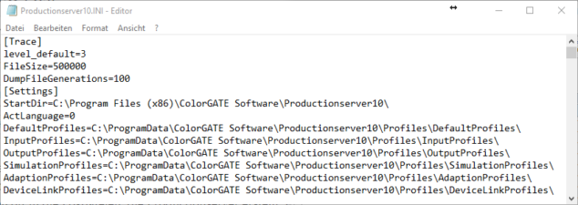 Das reicht aber nicht, damit auch die cgrip.exe und cgprint.exe mehr Informationen liefern. Dafür muss man zunächst ini-Dateien (cgrip.ini und cgprint.ini) mit diesen Zeilen in dem Ordner ablegen, in dem die cgrip.exe und cgprint.exe sich befinden, also standardmäßig C:Program Files (x86)ColorGATE SoftwareProductionserver10.