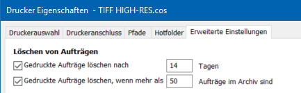II. Unter “Erweiterte Einstellungen” in den “Drucker Eigenschaften” ist es auch möglich, gedruckte Aufträge nach einem Zeitraum zu löschen oder davon abhängig, wie groß die Zahl an Aufträgen im Archiv ist.
