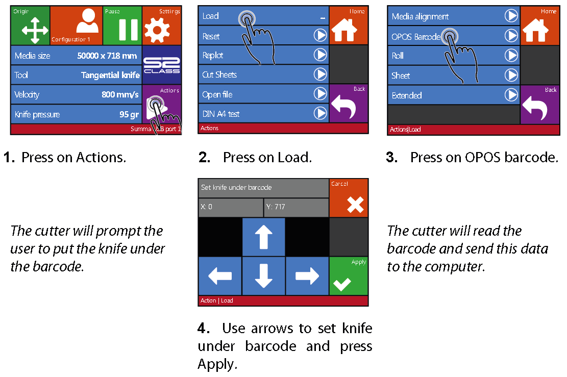Wenn die Variante „Manuelles Laden der OPOS Marken“ verwendet wird, wählen Sie den entsprechenden Schneidejob aus und schicken ihn über den CutServer zum Summa Schneideplotter. Anschließend wird automatisch das OPOS YX Verfahren verwendet, indem Sie lediglich das Schneidemesser auf die erste Marke neben dem Barcode platzieren müssen. Die Schneidemarken werden nun automatisch eingemessen. Die Anzahl der jeweiligen Schneidemarken wird anhand der Größe des Motivs berechnet.