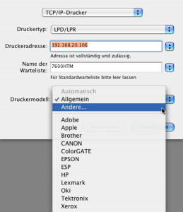 4. Im Menü “Drucker Modell” klicken Sie “Andere” und wählen die zuvor erstellte PPD aus dem Verzeichnis aus: Macintosh HD/ Library/ Printers/ PPDs/ Contents/Resources/ en.lproj aus.