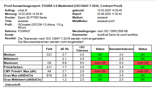 Beim Proof-Auswertungsreport wird der Druck mit Referenzwerten (z. B. ISOcoated) oder ICC-basierten Standards verglichen. Ideal, um Farbverbindlichkeit gegenüber Kunden oder Markeninhabern nachzuweisen.