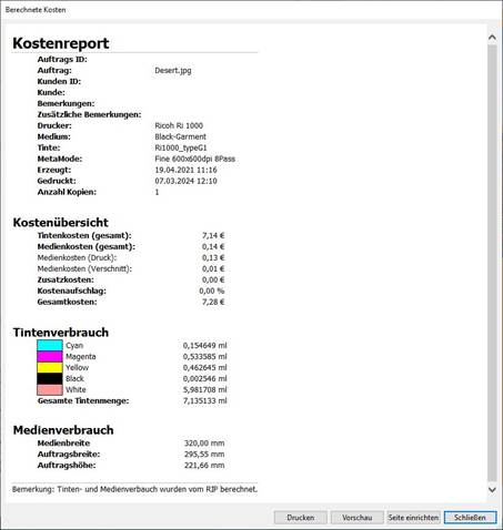 Um einen Kostenkalkulationsreport erzeugen und drucken zu können, benötigen Sie das Cost Calculation Module. Informationen zu diesem Modul finden Sie auf unserer Webseite. Vorausgesetzt wird auch, dass Aufträge mit aktivierter Kostenberechnung gerippt oder gedruckt damit die Verbrauchskosten ermittelt werden können. Um die Kosten genau ermitteln zu können, geben Sie einmalig die Preise der verwendeten Medien und Tinten ein.