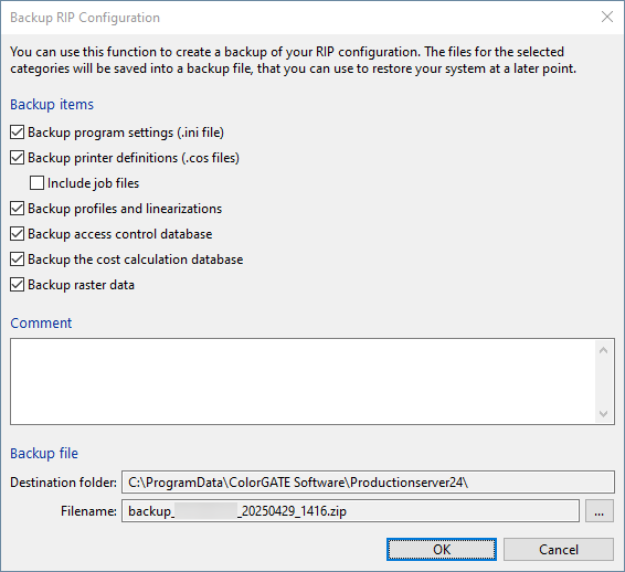 - The printer definitions contain, e.g., the hotfolder settings. You can also save all jobs with the Include job files option. This allows you to reprint them without having to rip them again.