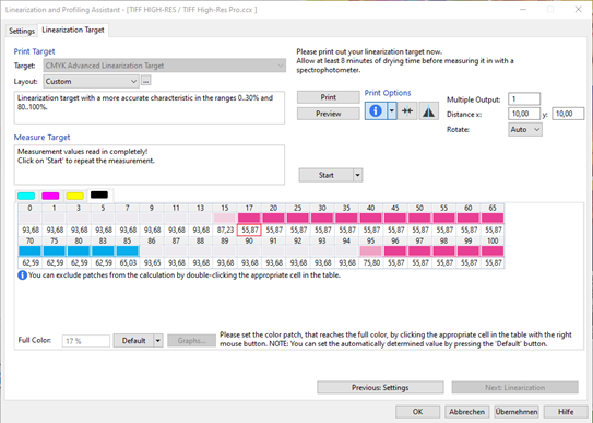Using the Linearization Assistant, you calculate the optimal characteristic print curve to achieve a linear print (if you want to print at 60% density, you actually do so) and thus a consistent color laydown. Then print and measure a linearization target to determine the actual ink coverage. You will need this to get 100% color density for each color channel.