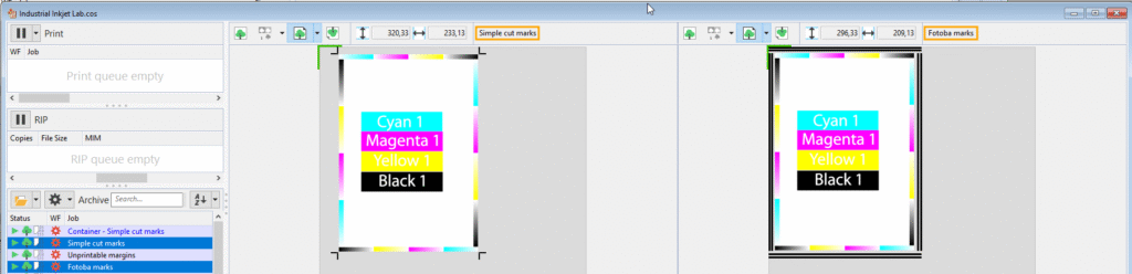 • All additionally printed elements such as control wedges, job info text / QR codes, confidence strips and all types of marks (cut marks, tiling marks, registration marks, Fotoba marks etc.) are displayed together with the print motif in the media preview.
