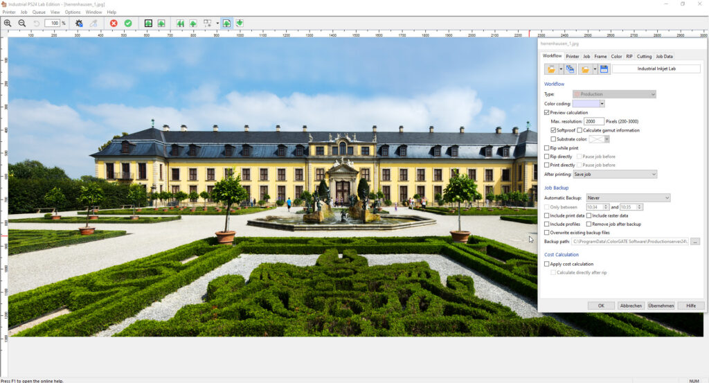 The advanced preview also allows you to view and change job settings. In addition, you can enlarge or reduce the size of the display and display the color composition of the image. Detailed information about the advanced preview can be found in the online help or in the manual in the Download Area of our Support Site (login required).