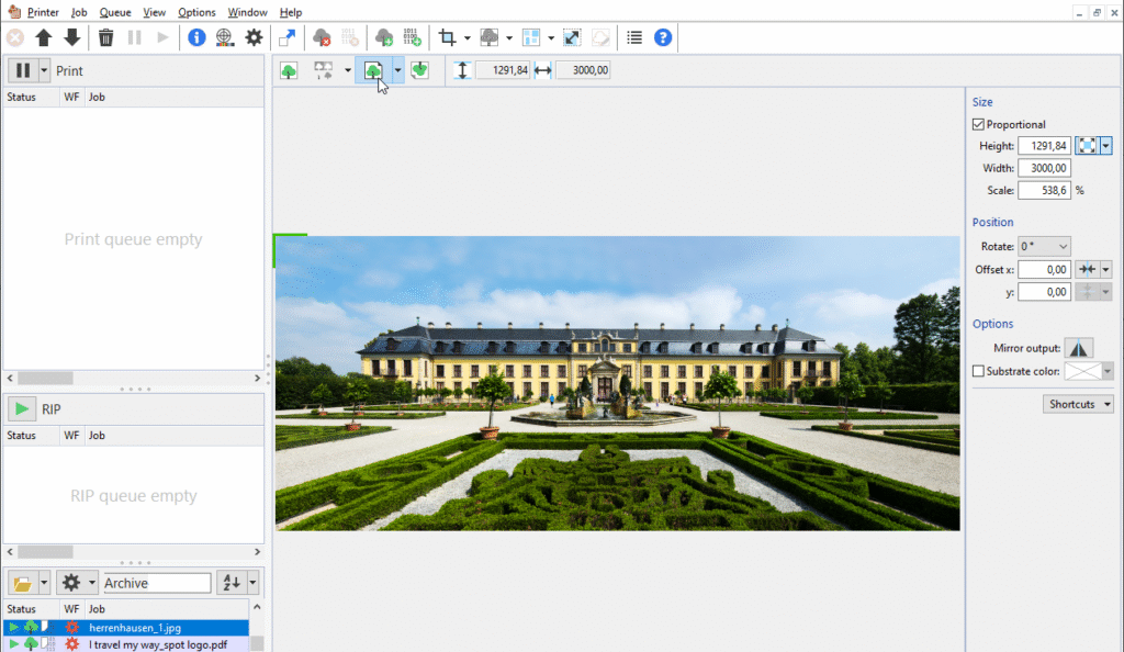 • Quick access to the job settings: In the media preview, you have direct access to the job settings for size, position and other options. This allows you to check changes immediately in the preview.