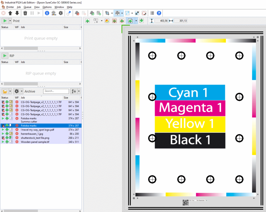 Additionally printed elements are all elements that are not part of the motif but are printed by our software, e.g., control wedges, job info text / QR codes, confidence strips and all types of marks (cutting marks, tiling marks, registration marks, Fotoba marks etc.). Detailed information about the individual elements can be found in the online help or in the manual. You can find the manual in the Download Area on our Support Site (login required).