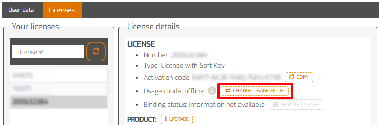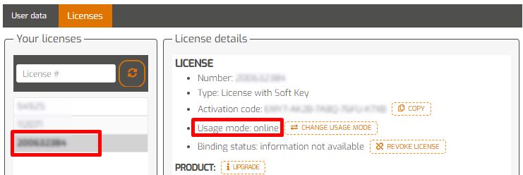 - On the right side of the tab you can see whether the license is currently in online or offline mode.